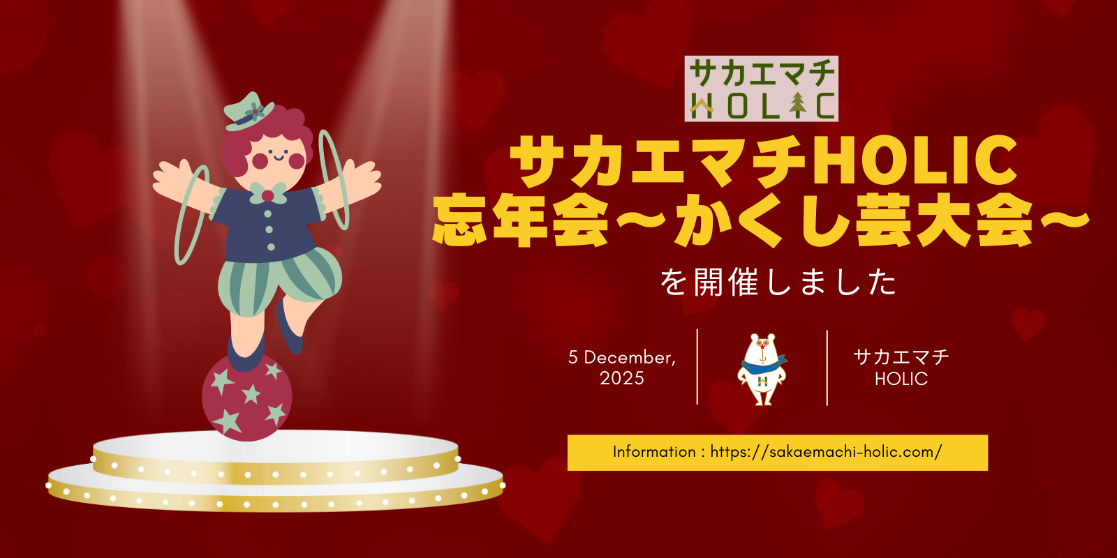 12月5日(金)にサカエマチHOLIC忘年会〈かくし芸大会〉を開催しました!今回は、会員さんの“意外な特技”に光を当てたかくし芸大会をメイン企画として […]
